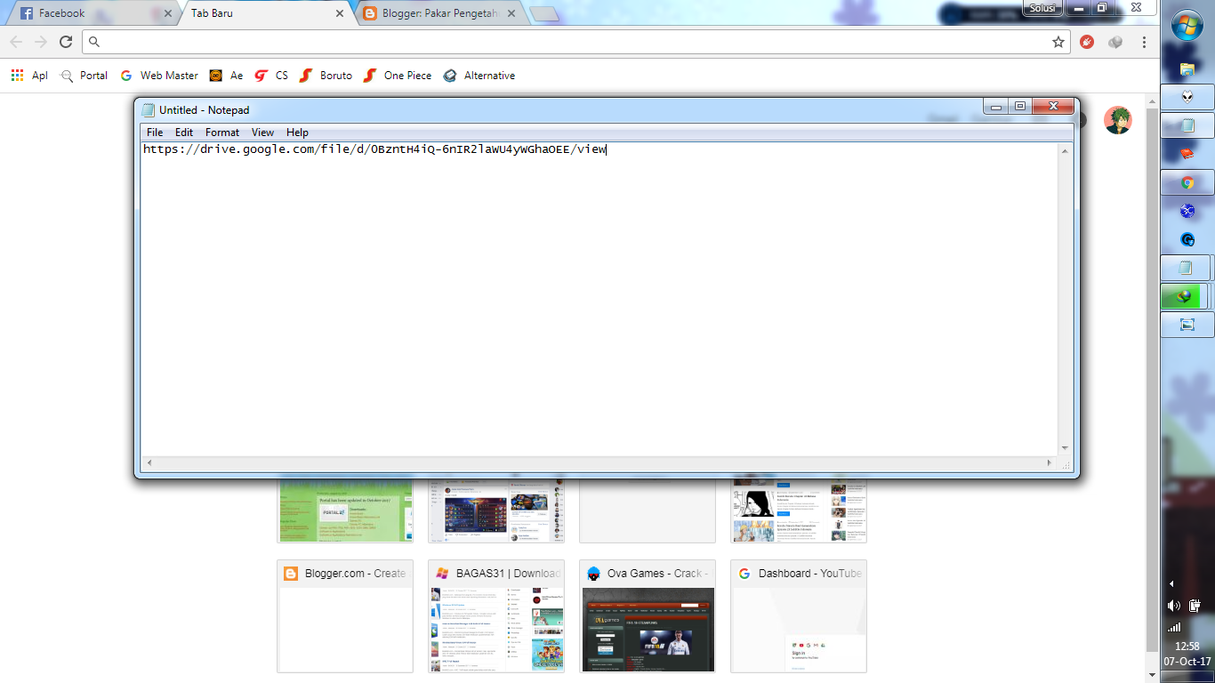 3. Copy "KODE ID FILE" yang ada pada tab / kolom Link di browser kamu yaitu seperti contoh diatas yang sudah saya Tandai ''0BzntH4iQ-6nIR2laWU4yWGhaOEE'' yang terdapat di antara "https://drive.google.com/uc?id=" dan "&export=download" (ingat Kode file yang ingin kamu download, bukan yang saya contohkan ini)